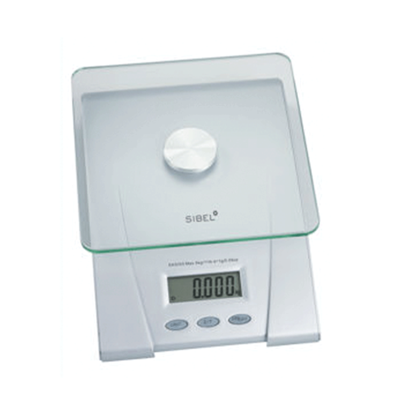 Digital scale with glass pan. Large LCD display. Max capacity 5kg, 1g division. Tare and auto stop function. 2 AAA batteries not included.